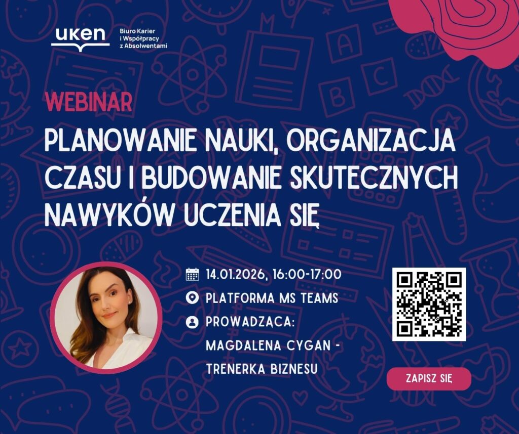 Biuro Karier zaprasza studentów i studentki na webinar poświęcony efektywnemu uczeniu się i przygotowaniu do sesji egzaminacyjnej. To praktyczne spotkanie dla osób, które chcą lepiej zaplanować naukę, skuteczniej zapamiętywać materiał i zmniejszyć stres związany z egzaminami.