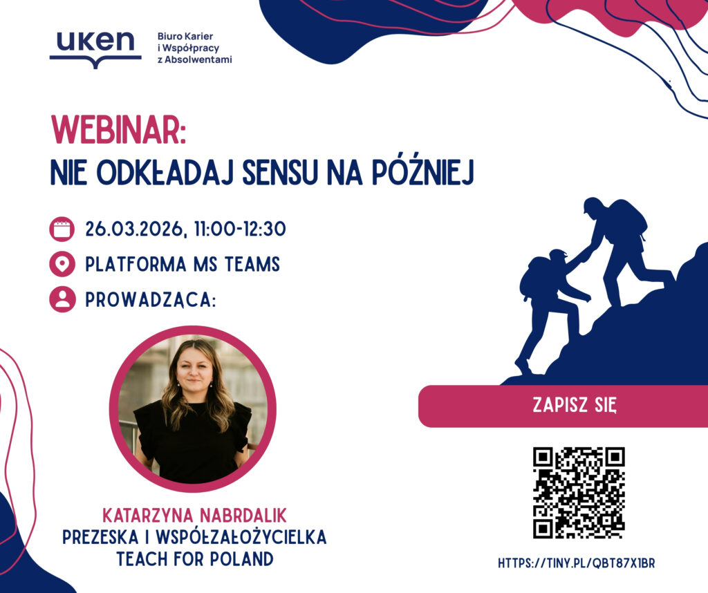 W odpowiedzi na te pytania Biuro Karier i Współpracy z Absolwentami, we współpracy z Fundacją Teach for Poland, zaprasza do udziału w webinarze pt. „Nie odkładaj sensu na później”.