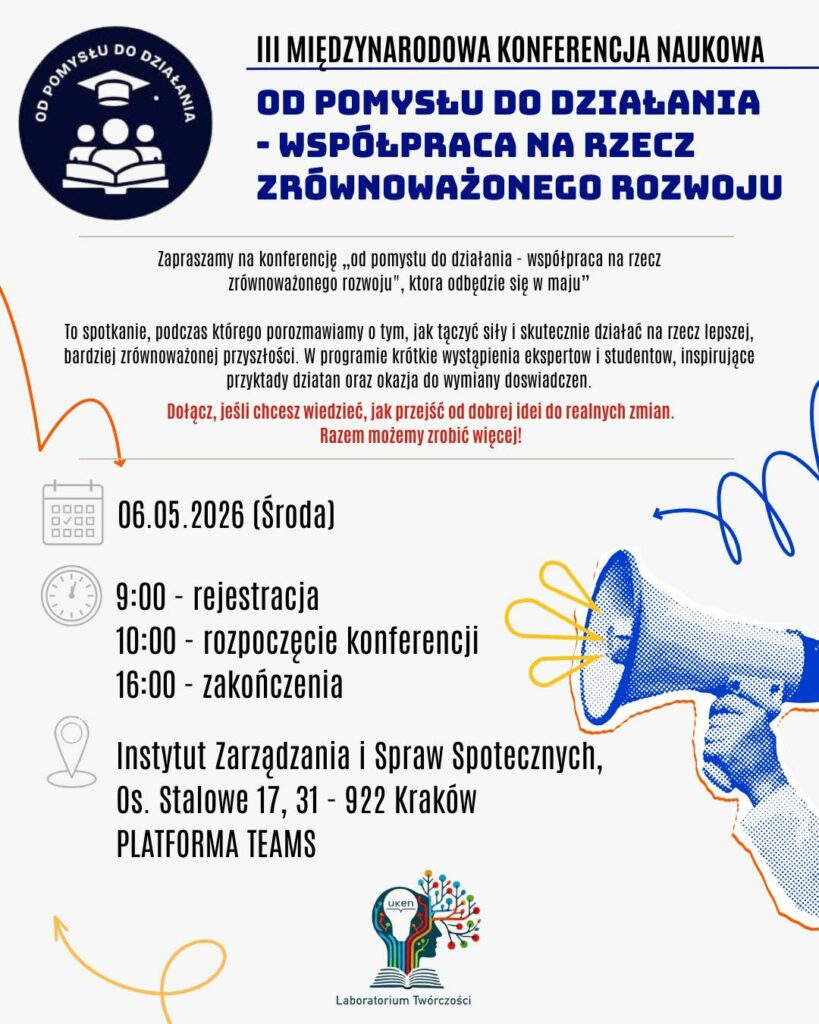 Koło Naukowe Laboratorium Twórczości serdecznie zaprasza na III Międzynarodową Konferencję Naukową „Od pomysłu do działania – współpraca na rzecz zrównoważonego rozwoju”. To wyjątkowe wydarzenie, podczas, którego łączymy siły świata nauki, aby wspólnie szukać skutecznych rozwiązań dla lepszej przyszłości.
