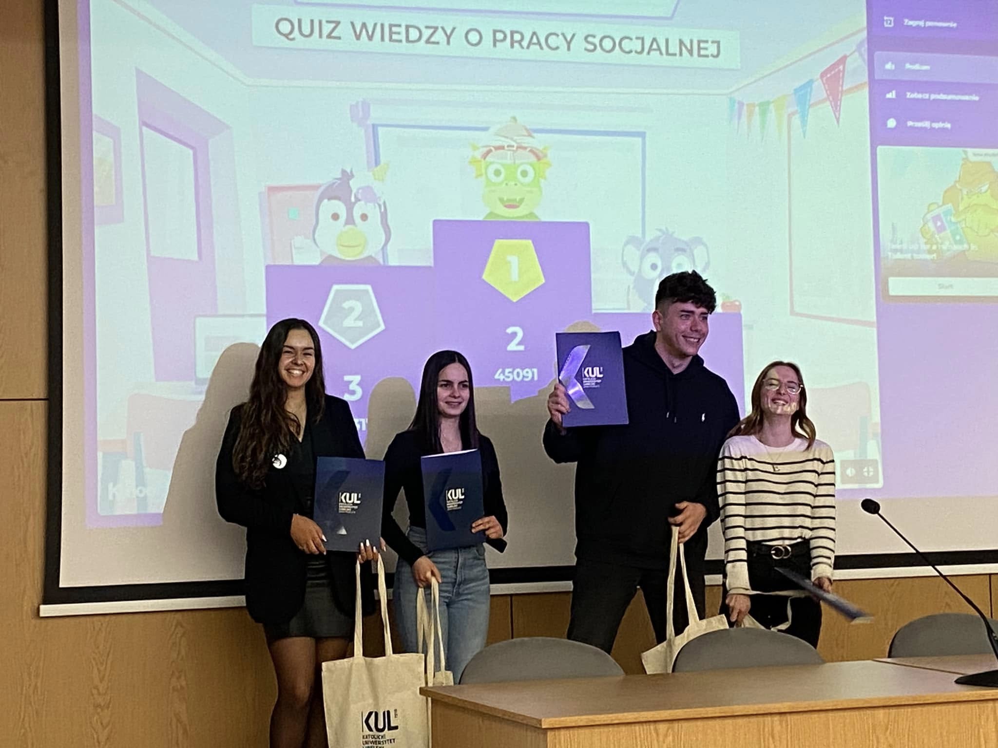 Najbardziej emocjonującym punktem programu okazał się Quiz Wiedzy z Pracy Socjalnej, składający się z aż 62 pytań, w którym nasze studentki odniosły miażdżące zwycięstwo, zajmując wszystkie stopnie podium! Ten wspaniały triumf jest dowodem na ich wyjątkowe przygotowanie merytoryczne, pasję i głębokie zaangażowanie w dziedzinę pracy socjalnej.