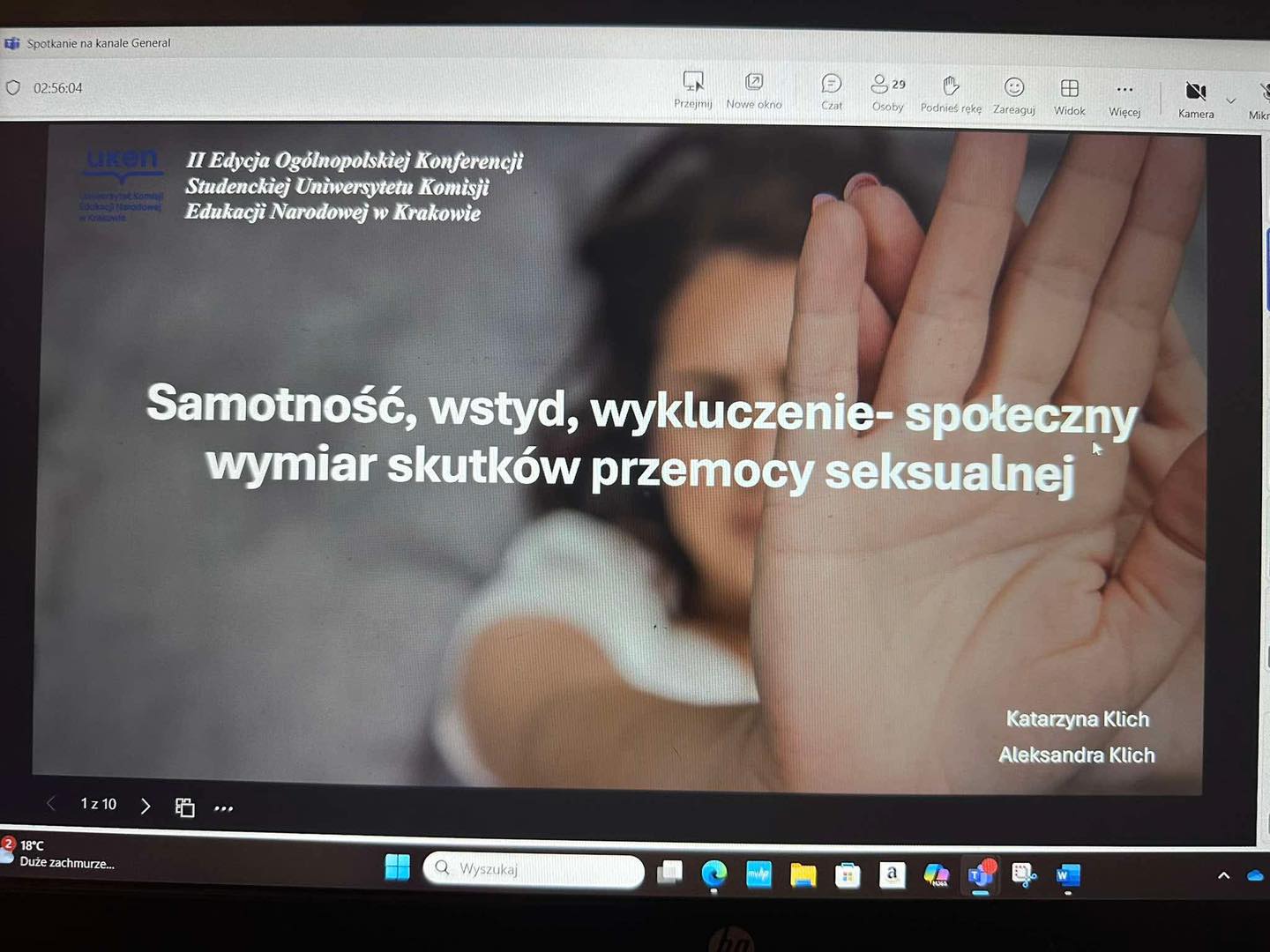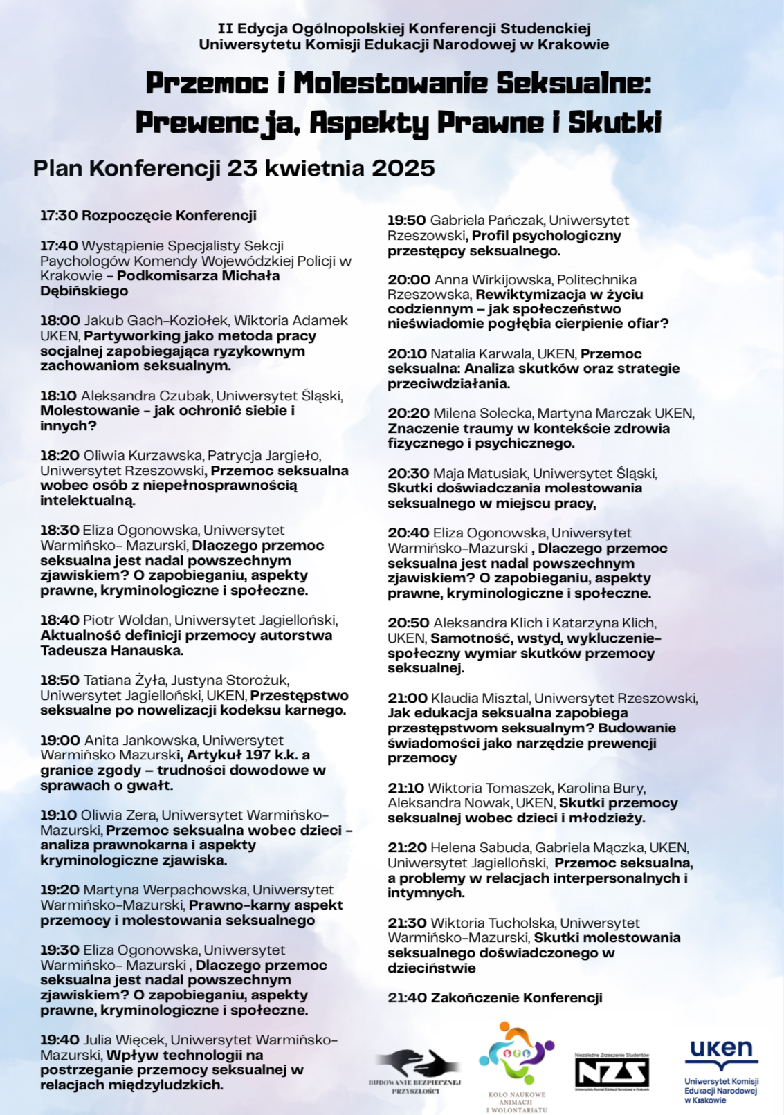 Wśród wystąpień znalazły się prelekcje członków naszego koła, Wiktoria Adamek i Jakub Gach-Koziołek z tematem “Partyworking jako metoda pracy socjalnej zapobiegająca ryzykownym zachowaniom seksualnym”, Martyna Marczak i Milena Solecka z prezentacją „Znaczenie traumy w kontekście zdrowia fizycznego i psychicznego – jak pokonać długofalowe skutki przemocy seksualnej?” oraz Aleksandra Klich i Katarzyna Klich z wystąpieniem „Samotność, wstyd, wykluczenie – społeczny wymiar skutków przemocy seksualnej”. Całość konferencji koordynowały Wiktoria Tomaszek oraz Helena Sabuda.