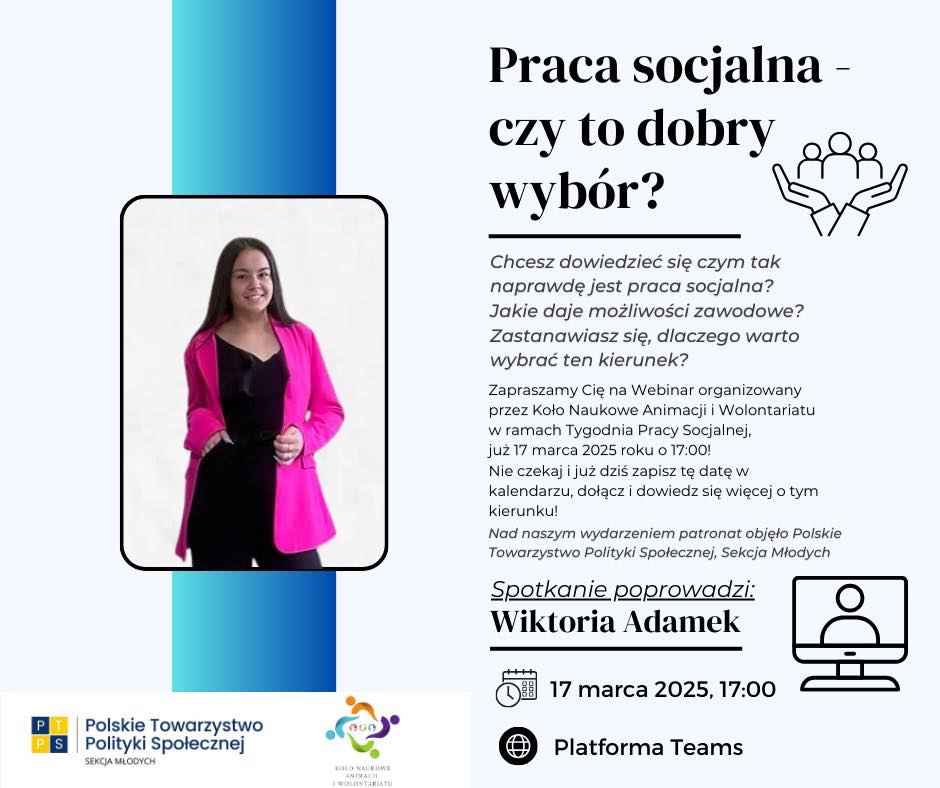 17 marca 2025 roku Koło Naukowe Animacji i Wolontariatu zorganizowało i z powodzeniem przeprowadziło dedykowany webinar zatytułowany „Praca socjalna – czy to dobry wybór?”. Spotkanie to, zorganizowane w ramach Tygodnia Pracy Socjalnej, miało na celu przybliżenie zainteresowanym osobom istoty pracy socjalnej, jej różnorodnych możliwości zawodowych oraz kluczowych argumentów przemawiających za wyborem tego kierunku studiów.