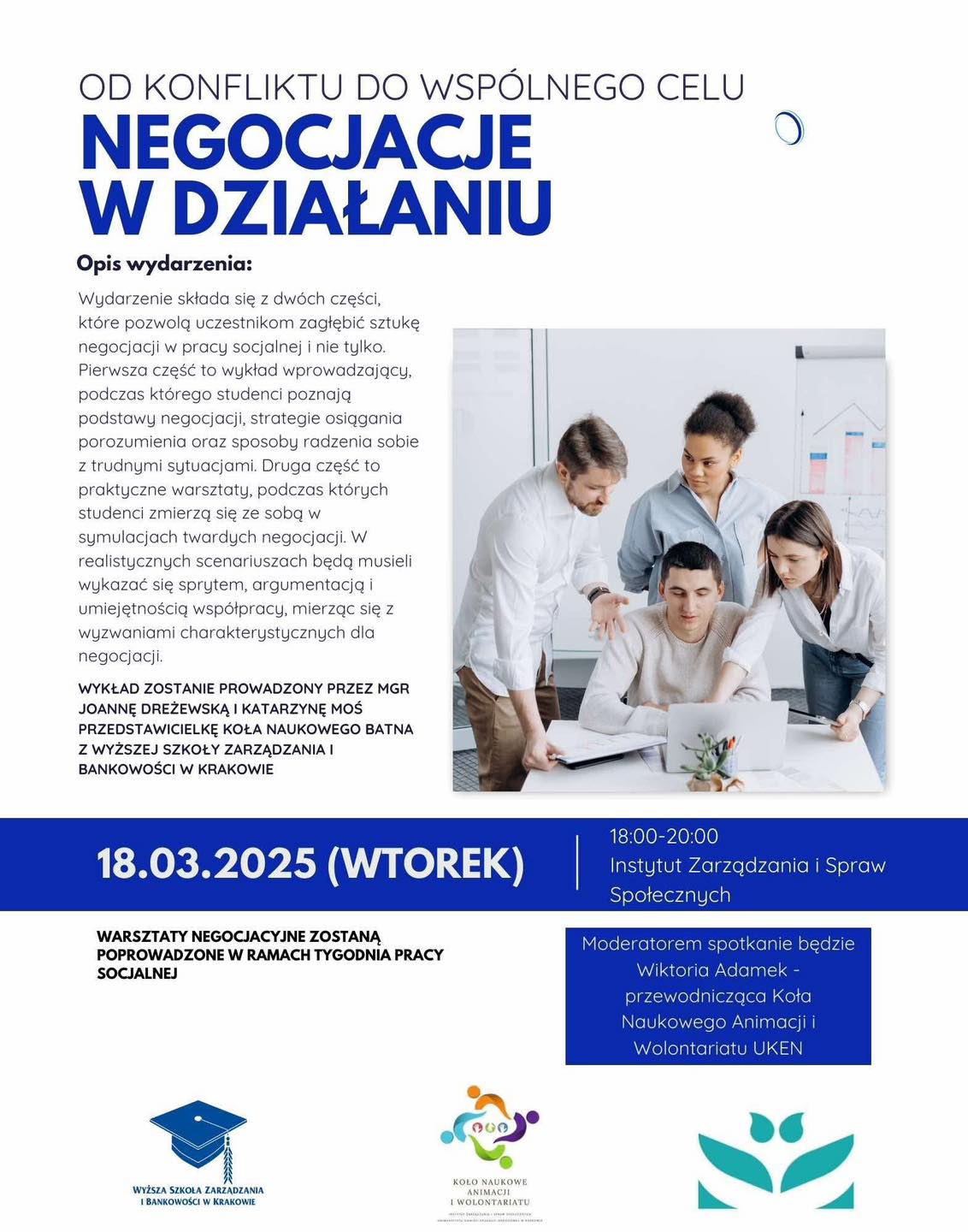 18 marca 2025 roku w ramach Tygodnia Pracy Socjalnej Koło Naukowe Animacji i Wolontariatu zorganizowało inspirujące warsztaty negocjacyjne we współpracy z członkami Koła Naukowego BATNA z Wyższej Szkoły Zarządzania i Bankowości w Krakowie.