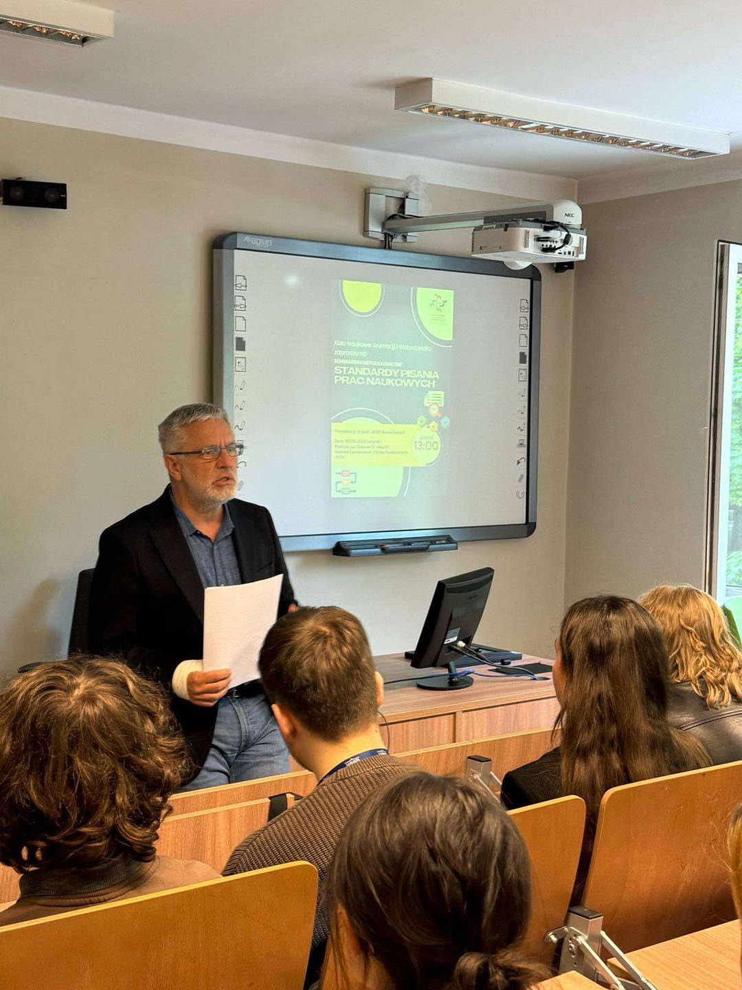 Spotkanie poprowadził dr Marek Banach, prof. UKEN – uznany ekspert w zakresie metodologii badań naukowych, którego dorobek i doświadczenie od lat stanowią ważny punkt odniesienia dla studentów i młodych badaczy. Podczas seminarium omówił on kluczowe zasady konstruowania prac naukowych, zawierając uwagę zarówno na poprawność metodologiczną, jak i na etykę badań. Prelekcja miała charakter nie tylko dydaktyczną, ale również inspirujący – prelegent podkreślił znaczenie rzetelności, krytycznego myślenia oraz świadomego doboru narzędzi badawczych w procesie tekstów naukowych.